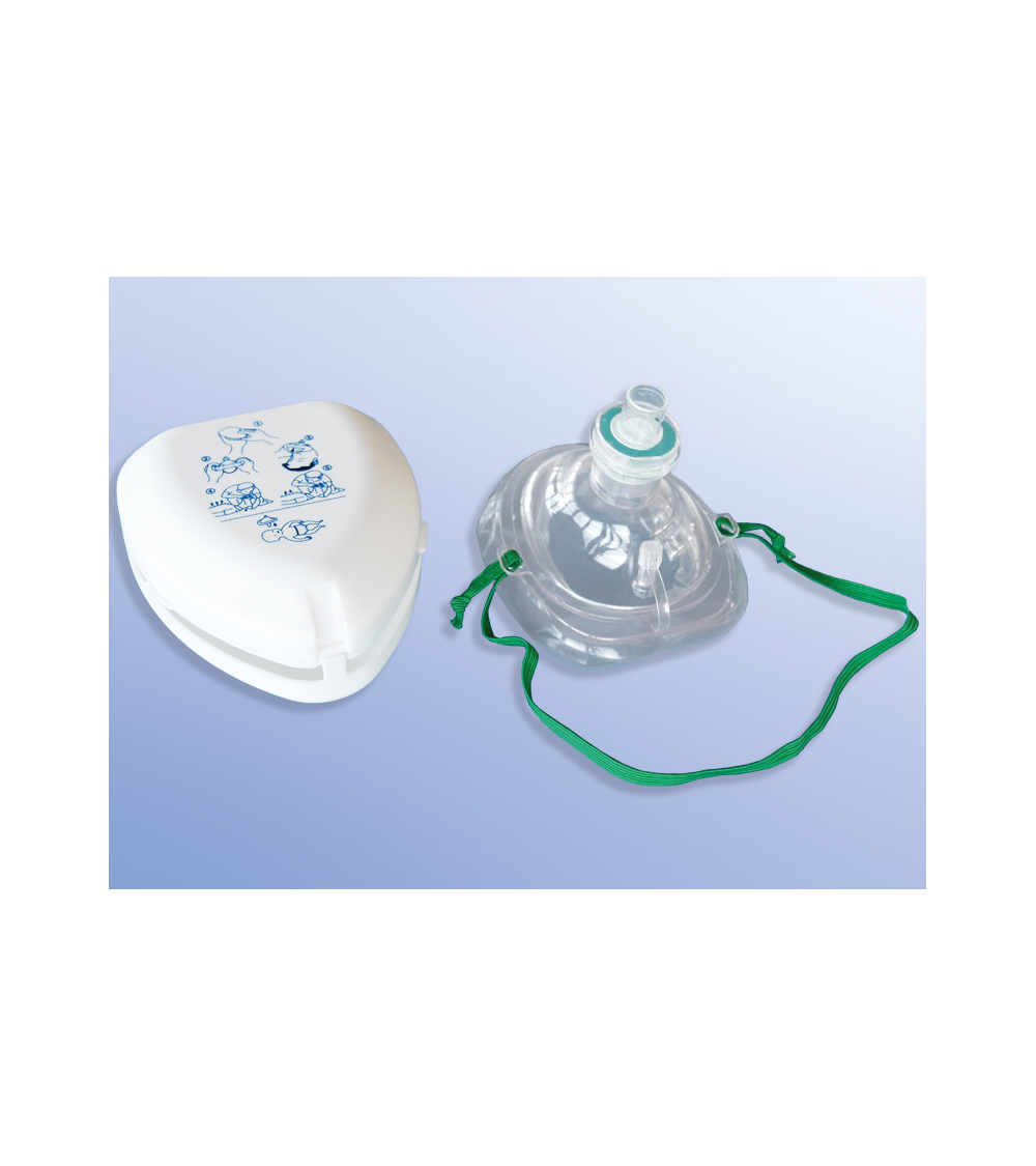 Die Taschenmaske ist in einer Kunststoffhülle verpackt und umfasst ein Einwegventil und einen wasserabweisenden Filter, einen Sauerstoffanschluss und ein Kopfband.5
