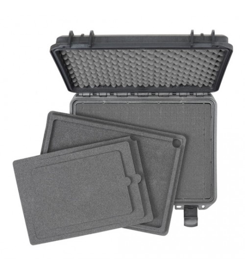Lieferung mit einer starren Platte mit modularen Schaumstoffeinlagen für Tablets und Laptops, darunter zwei vorgestanzte Schaumstoffeinlagen (3 cm) + eine durchgehende Schaumstoffeinlage (1 cm) im Boden und eine Wabenschaumstoffeinlage im Deckel