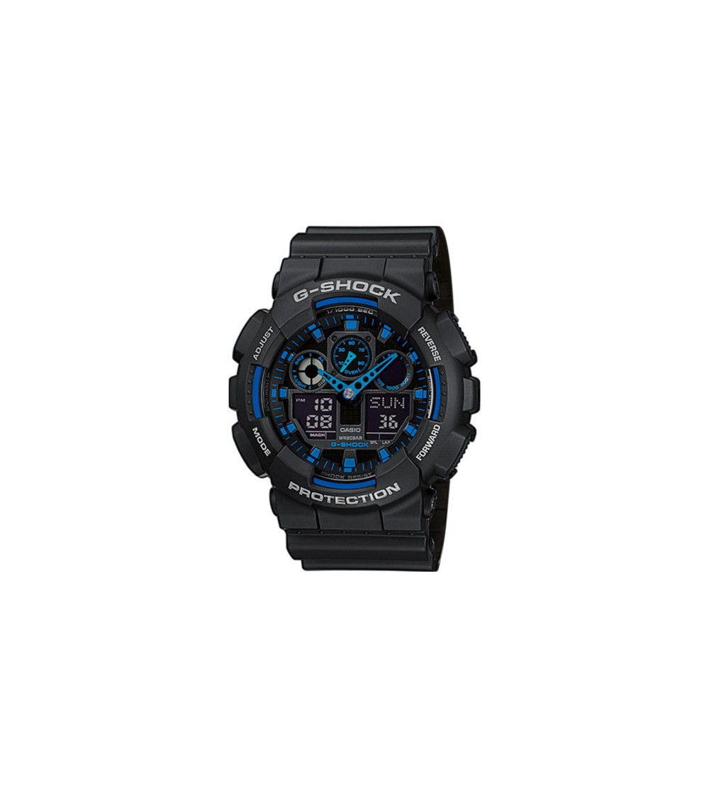Die Armbanduhr G-Shock GA-100 ist modern im Design und dank ihres Zifferblatts aus Mineralglas und ihres Gehäuses und Armbands aus Harz, einem strapazierfähigen und flexiblen Material, äußerst robust. Außerdem verfügt sie über eine Magnetfeldbeständigkeit der Klasse 1 nach JIS. Ihr Zifferblatt umfasst vier große LCD-Anzeigen mit breiten Zeigern aus Aluminium für die Stunden und Minuten. Die symmetrische Anordnung der analogen und digitalen Anzeigen verleiht ihr einen dynamischen Stil.