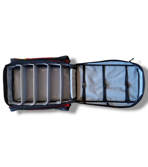 Für medizinische Module. Zwei lange Seitentaschen aus verstärktem PVC. Mit gelben und grauen Streifen. Zusätzliche rechteckige Kunststoffverstärkungen an den Seiten über den Riemen an den Seitentaschen in Höhe der gelben und grauen Streifen. Magnetverschlüsse an den Taschen.