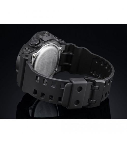 Mit ihren dynamischen Linien, die sowohl futuristisch als auch trendy sind, ist die analoge und digitale Armbanduhr G-Shock GA-700 dank ihres Zifferblatts aus Mineralglas und ihres Gehäuses und Armbands aus Harz, einem strapazierfähigen und flexiblen Material, besonders robust. Die aus Harz geformten Zeiger sorgen für einen massiven, strukturierten und robusten Stil, dessen Optik an graviertes Metall erinnert. Das Zifferblatt bildet mit seinen dreidimensionalen Skalen und Indizes eine Synergie mit den Zeigern.