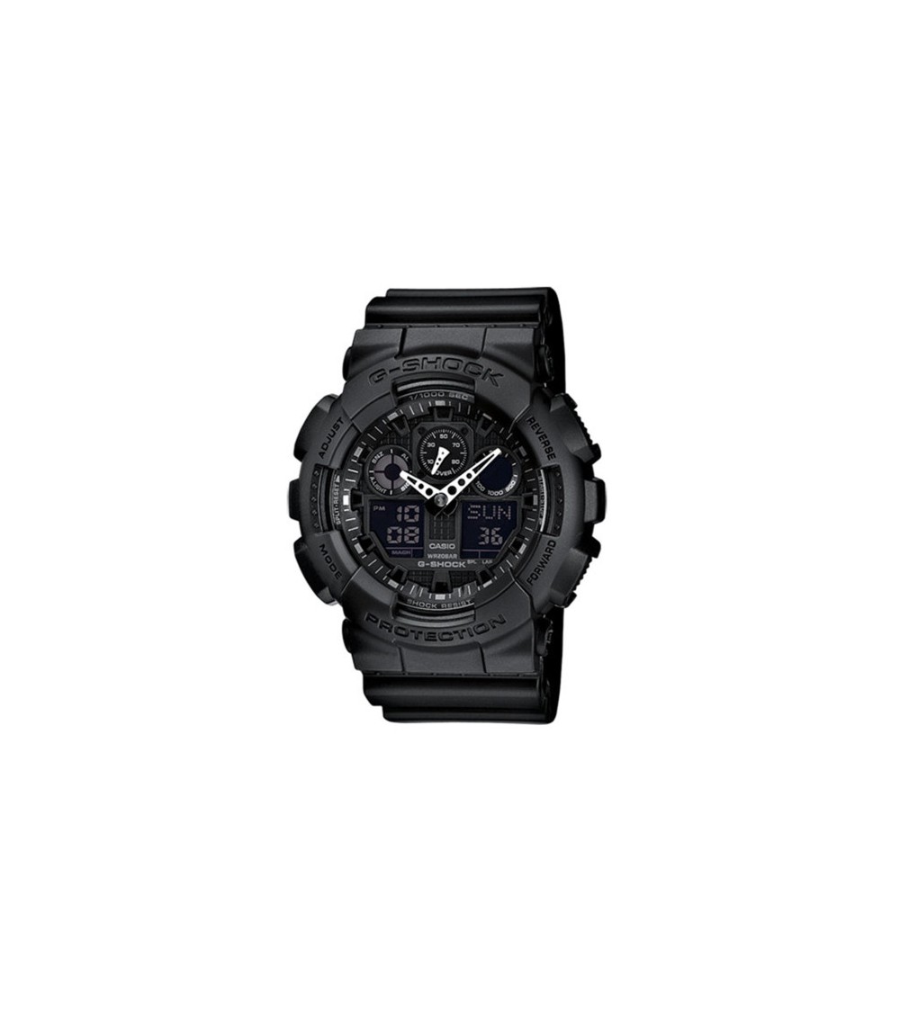 Die Armbanduhr G-Shock GA-100 ist modern im Design und dank ihres Zifferblatts aus Mineralglas und ihres Gehäuses und Armbands aus Harz, einem strapazierfähigen und flexiblen Material, äußerst robust. Außerdem verfügt sie über eine Magnetfeldbeständigkeit der Klasse 1 nach JIS. Ihr Zifferblatt umfasst vier große LCD-Anzeigen mit breiten Zeigern aus Aluminium für die Stunden und Minuten. Die symmetrische Anordnung der analogen und digitalen Anzeigen verleiht ihr einen dynamischen Stil.