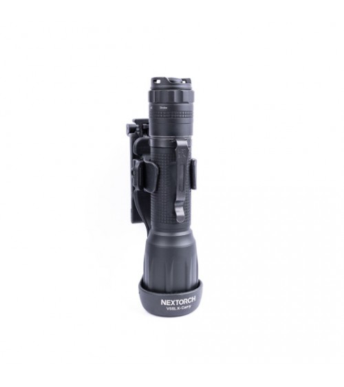 Der starre und um 360° drehbare Lampenhalter V55L ermöglicht das Tragen einer Lampe mit einem Gehäusedurchmesser zwischen 2,4 und 2,8 cm und einem Kopfdurchmesser zwischen 2,7 und 3,9 cm am Gürtel, am Gürtelriemen oder an Schlaufen M.O.L.L.E. Er ermöglicht auch die Verwendung der Lampe im Freihandmodus. Der Lampenhalter verfügt über ein ergonomisches und schnelles Verriegelungssystem.