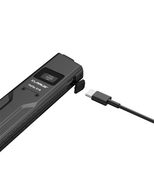 La lampe X1-E est une lampe puissante et compacte au design innovant. Elle bénéficie de deux interrupteurs multifonctions sur le dessus pour accéder facilement aux différents modes. Son écran LCD indique le mode sélectionné et le niveau de charge restant de la batterie interne qui se recharge grâce à sa prise USB-C intégrée ; dans ce cas, l'écran LCD indique l'état d'avancement de la recharge.